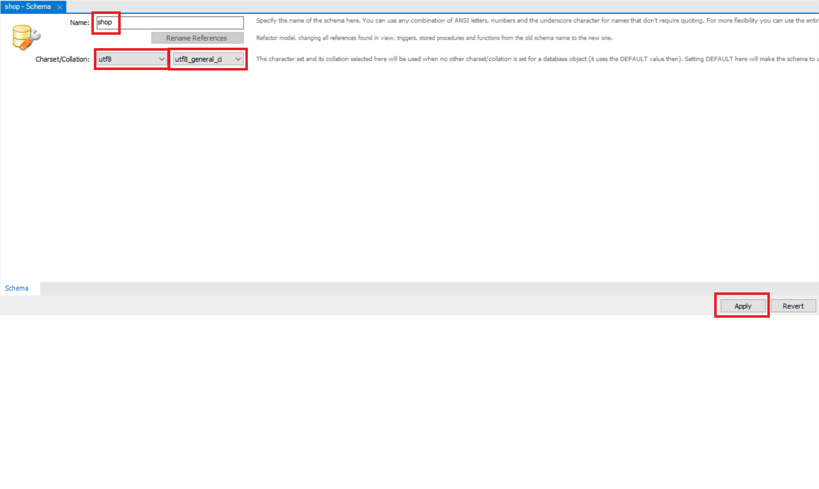 위와 같이 스키마 이름을 shop으로 만들어준다.
